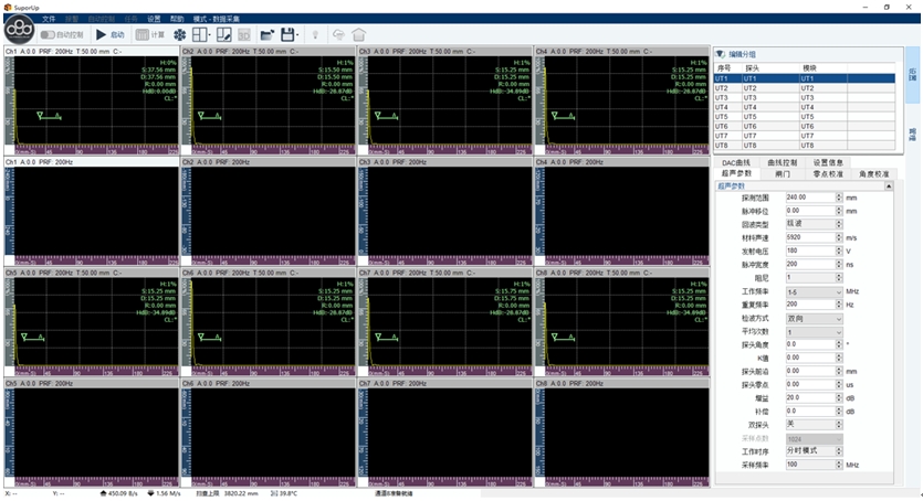- 通过网络和PC相连,配合上位机软件,用户可以远程控制超声模块按照设定的参数发射,接收,采集回波数据,按照常规超声信号处理流程,对回波进行闸门设置,测量,显示,保存等。