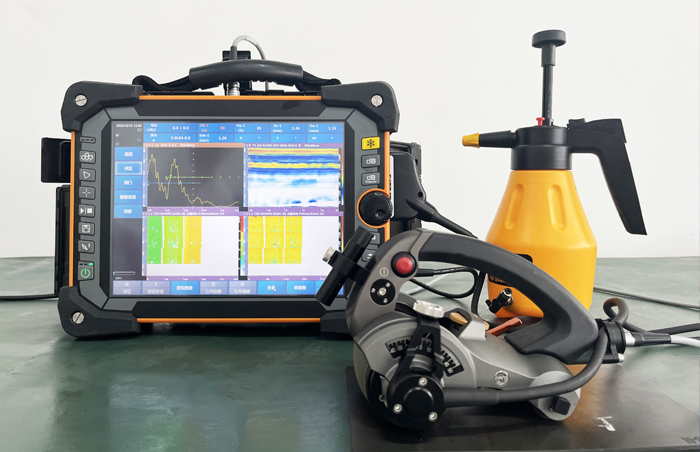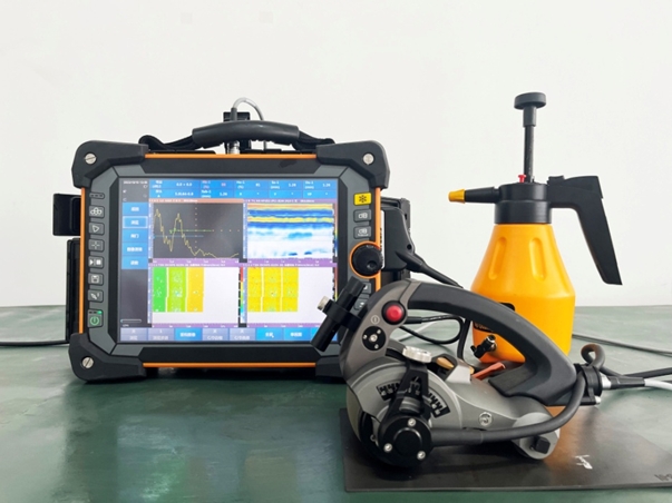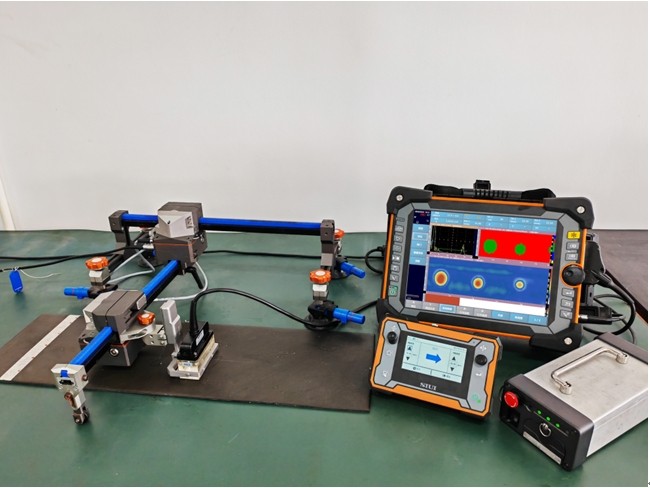 检测系统由四部分组成,包括相控阵超声检测仪、轮式水浸扫查架、相控阵探头和分析软件。检测系统能够轻松完成检测工艺制定、探头校准、数据采集与数据分析。